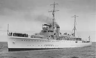 Following the outbreak of the Second World War, Hindustan was deployed to the Persian Gulf, patrolling the Straits of Hormuz and operating as part of the East Indies Station of the Royal Navy.[5] In August 1940, Italy invaded British Somaliland, and Hindustan was deployed to Berbera, landing three of her 3-pounder guns to aid the defences, and covering the evacuation of Commonwealth forces from Berbera from 15 to 19 September.[6] Hindustan was then refitted at Bombay (now Mumbai), being fitted with Sonar,[2] previous plans to re-arm her with anti-aircraft 4-inch guns being abandoned.[7]