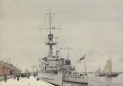 A few days later, the 6th LCS, under the command of Rear-Admiral Edwyn Alexander-Sinclair, was ordered to the Baltic Sea to support the Baltic States as they attempted to secure their independence from Russia.[9] Together with her half-sister Caradoc and five destroyers, the ship bombarded Bolshevik positions east of Reval (Tallinn), Estonia, on 14 December and brought the Russian offensive to a halt after they destroyed the one bridge connecting them with Petrograd (Saint Petersburg), Russia. The next day, her starboard AA gun was dismounted and given to the Estonians. The 6th LCS was recalled in early January 1919 and arrived back in Rosyth on 10 January.[11]