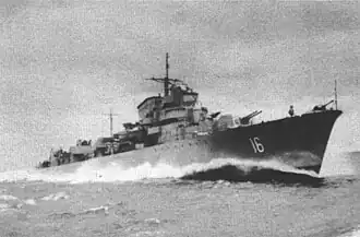 The destroyer had a length overall of 112 metres (367 ft 5.4 in) and 107 m (351 ft 0.6 in) between perpendiculars, a beam of 11.2 m (36 ft 8.9 in) and a draught of 3.4 m (11 ft 1.9 in).[4] Displacement was 1,880 tonnes (1,850 long tons; 2,070 short tons) standard and 2,400 tonnes (2,400 long tons; 2,600 short tons) full load. Power was provided by two Penhoët boilers feeding two de Laval geared steam turbines rated at 44,000 shaft horsepower (33,000 kW) and driving two shafts. Design speed was 35 knots (65 km/h; 40 mph). A single funnel was fitted. 300 long tons (300 t) of oil were carried, giving a design range of 2,500 nautical miles (4,600 km; 2,900 mi) at 20 kn (37 km/h; 23 mph). The ship's complement was 210 officers and ratings.[3]