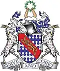 Barry wavy of six argent and azure on a bend gules a lion passant guardant Or, on a wreath argent and azure colours issuing from clouds two naked arms embowed holding a laurel wreath all proper, on either side a goat of India argent flecked gules and membered Or