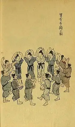 After the festival ends, the huts are dismantled by shaking them apart from the rooftops. Additionally, on the night of the fifteenth day of the eighth month (Jugoya), people dress in festive clothing, share meals, and wait for the moonrise. Once the moon rises, they perform hand dances, sumo matches, and tug-of-war contests, staying up through the night before returning home the next morning.[1][2]