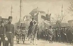 According to Laonicus Chalcocondyles, Hagia Sophia was a refuge for the population during the city's capture.[95] Despite the ill-repute and empty state of Hagia Sophia after December 1452, Doukas writes that after the Theodosian walls were breached, the Byzantines took refuge there as the Turks advanced through the city.[95] He attributes their change of heart to a prophecy.[95]