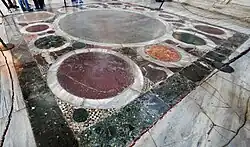 The basilica was built by architect Rufinus.[38][39] The church's main entrance, which may have had gilded doors, faced west, and there was an additional entrance to the east.[40] There was a central pulpit and likely an upper gallery, possibly employed as a matroneum (women's section).[40] The exterior was decorated with elaborate carvings of rich Theodosian-era designs, fragments of which have survived, while the floor just inside the portico was embellished with polychrome mosaics.[33] The surviving carved gable end from the centre of the western façade is decorated with a cross-roundel.[33] Fragments of a frieze of reliefs with 12 lambs representing the 12 apostles also remain; unlike Justinian's 6th-century church, the Theodosian Hagia Sophia had both colourful floor mosaics and external decorative sculpture.[33]