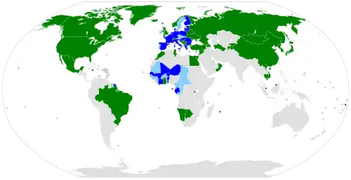 The Hague System has 81 members covering 98 countries as of January 2025.[8] All contracting parties to one or more of the instruments of the Hague Agreement are members of the Hague Union. A list is shown below: