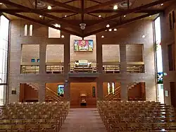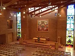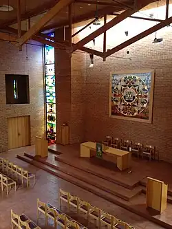 View across the Sanctuary showing the recessed sanctuary wall and exposed timber trusses below the ceiling.