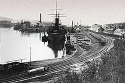 Rail tracks in Hakin in 1907, HMS Aurora berthed in the docks