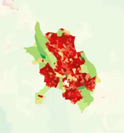In its natural state, Hamilton and environs was very swampy in winter with 30 small lakes connected to surrounding peatlands. Hamilton was surrounded by 7 large peat bogs such as Komakorau to the North and Rukuhia and Moanatuatua to the South, as well as many smaller ones all of which have now been drained with only small remnants remaining.[51] The total area of peat bog was about 655 km2.[52] Early photos of Hamilton East show carts buried up to their axles in thick mud. Up until the 1880s it was possible to row and drag a dinghy from the city to many outlying farms to the North East. This swampy, damp environment was at the time thought to be an ideal breeding ground for the TB bacillus, which was a major health hazard in the pioneering days. The first Hamilton hospital was constructed on a hill to avoid this problem. One of the reasons why population growth was so slow in Hamilton until the 1920s was the great difficulty in bridging the many arms of the deep swampy gullies that cross the city. Hamilton has 6 major dendritic gully complexes with the 15 km long, 12 branch, Kirikiriroa system being in the north of the city and the southern Mystery creek-Kaipaki gully complex being the largest.[53] Others are Mangakotukutuku, Mangaonua and Waitawhiriwhiri.[54]