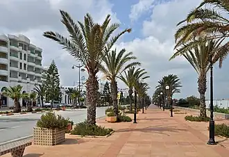 The climate is very much like the climate in Sousse. It borders a Hot-summer Mediterranean climate (Csa) and a Hot semi-arid climate (BSh) due to dry ground and hot temperatures in the summer.