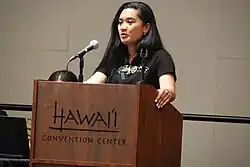 Maipi-Clarke speaking at a Young Pacific Leaders event held by the United States Department of State in 2017.