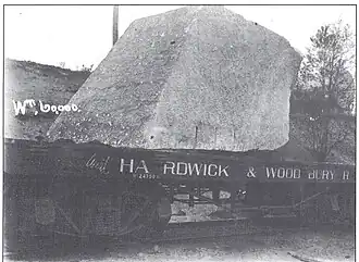 The general manager of the Hardwick & Woodbury, Edward H. Blossom, designed a special car for shipping large granite blocks. As reported by the Railroad Gazette in 1899, this car was built by the Laconia Car Company of New Hampshire to carry slabs of stone up to 13 by 17 feet (4.0 m × 5.2 m), 18 inches (460 mm) thick, weighing 20 tons. The car had a 36-foot (11 m) platform and a 20 by 4 feet (6.1 m × 1.2 m) "cradle" or "well" in the center. On each long side of this opening ran three long timbers, one above the next, parallel to the long edge of the car. Each stack of timbers was held together—and to the platform of the car—by six vertical rods, which descended to eight inches (20 cm) above the heads of the rails. Each pair of these rods supported an oak bar, 4 by 6 inches (10 by 15 centimetres), running the width of the car (approximately 8 feet or 2.5 m). These six oak pieces were trussed together to form the floor of the well, which supported the granite slab on its edge, its upper part braced on each side by seven timbers (see photo), whose lower ends were fastened to the floor.[1]: 54 [6]: 19, 22 On March 26, 1901, Blossom was granted U.S. patent No. 670,529 for this car, specifically its well bottom and adjustable support rods.[26]: 21 [38] The first finished stone shipped on this car was for a mausoleum in Chicago, and it seems likely that the car was designed with that sort of shipments in mind. This design was widely copied.[1]: 54