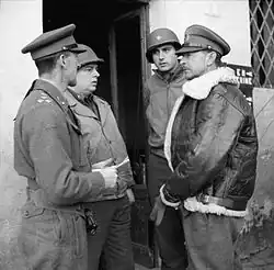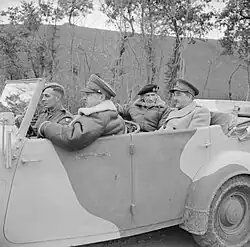 After Dunkirk, Alexander returned to the United Kingdom and continued to command I Corps, now guarding the coasts of Yorkshire and Lincolnshire as part of Northern Command.[53] He was promoted acting lieutenant-general in July 1940,[54] and in December 1940 he was appointed to succeed Claude Auchinleck as General Officer Commanding-in-Chief (GOC-in-C) of Southern Command, which was responsible for the defence of south-west England.[55][56][57][24] His rank of lieutenant-general was made permanent in December 1940.[53] While he was here he came into contact with Lieutenant-General Bernard Montgomery, who was then serving under his command as GOC of V Corps. Montgomery and Auchinleck had never seen eye-to-eye on much but Alexander, believing Montgomery, who had been one of Alexander's instructors at the Staff College in the mid-1920s, knew what he was doing, simply allowed Montgomery (or "Monty") to continue with what he was doing. The two men got along well and their relationship would continue in a similar manner later on in the war.[55]