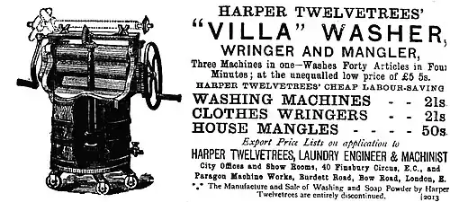 Twelvetrees then ventured into mechanical devices, styling himself “Laundry Engineer and Machinist”. In the 1870s-90s his most famous machine was the “Villa” which Mrs Beeton praised in her Book of Household Management as being "excellent for family use...very easy to work without being cumbersome... strong and very durable".[5]