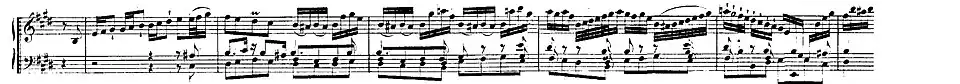 Of 38 bars in length and punctuated by fragmentary responses from the strings, the solo episode modulates through the keys of B major and C♯ minor to a cadence in F♯ minor. It is followed by a sequence of short passages alternating between ritornello material and solo material for the harpsichord drawn from both section B (semiquaver figures) and then section A (the beginning of the harpsichord theme). The ritornello segments move from F♯ minor to E major, the final segment modulating from F minor to B major and then E major. The next twelve bar solo episode continues with and develops the harpsichord's thematic material from section A, modulating from E major, to B major and then to the distant key of D♯ major. The 4-bar Vordersatz from the ritornello is then played in this key, then in G♯ major, reaching the key of C♯ minor. Section B ends symmetrically with an extended 33-bar solo episode, a variant of the long chromatic episode with which it began, After modulating through the keys of G♯ minor, C♯ minor and D♯ minor, the movement briefly halts in the manner of a Scarlatti da capo aria with a cadence to the mediant key of G♯ minor. The music resumes with a capitulation of section A.[6]