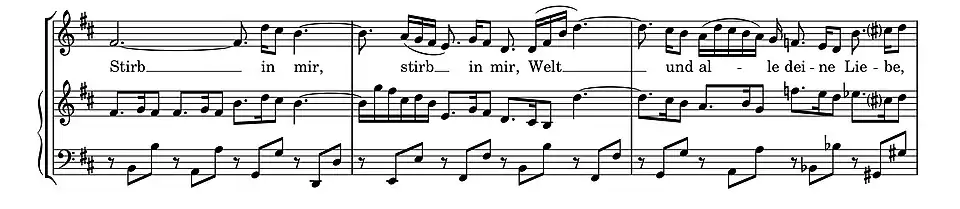 Like the other harpsichord concertos, BWV 1053 is generally agreed to be a transcription of a lost instrumental concerto. As with the harpsichord concerto BWV 1052, all the movements had previous incarnations in Leipzig cantatas written ten or more years prior to the 1738 or 1739 autograph manuscript, with the part of the melody instrument written for obbligato organ. The first and second movements of BWV 1053 corresponds to the opening Sinfonia (in D major) and alto aria "Stirb in mir, Welt" (in B minor) in Gott soll allein mein Herze haben, BWV 169; and the finale to the opening Sinfonia (in E major) in Ich geh und suche mit Verlangen, BWV 49. The cantatas, part of a series where Bach developed the obbligato organ as a chamber or orchestral instrument, were first performed in October and November 1726 in the Thomaskirche, within two weeks of each other. The scoring in BWV 169 includes two oboes and a taille as ripieno instruments in the sinfonia and an oboe d'amore in the aria. In the aria, the lines of the alto soloist and organ weave around each in what Alfred Dürr has described as "undoubtedly one of the most inspired vocal pieces that Bach ever wrote ... a passionate submersion in heavenly love."