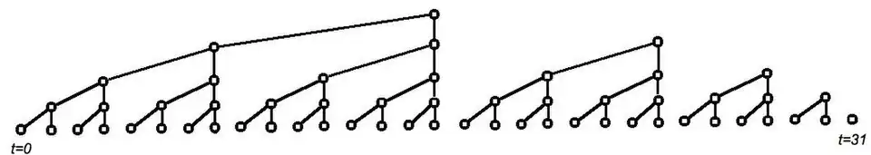 There are different algorithms that can be used to build a hash calendar and extract a relevant hash chain per second. The easiest is to imagine the calendar being built in two phases. In the first phase, the leaves are collected into complete binary trees, starting from left, and making each tree as large as possible.