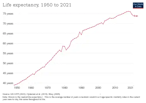 According to the World Health Organization (WHO), as of 2000, Iran ranks 58 in healthcare and 93 in health-system performance.[9] In 2016, Bloomberg News ranked Iran 30th most efficient healthcare system ahead of the United States and Brazil.[10] The report shows life expectancy in Iran is 75.5 years and per capita spending on healthcare is $346.[11][10] The health status of Iranians has improved over the last two decades. Iran has been able to extend public health preventive services through the establishment of an extensive Primary Health Care Network.[12] As a result, child and maternal mortality rates have fallen significantly, and life expectancy at birth has risen remarkably. Infant (IMR) and under-five (U5MR) mortality have decreased to 28.6 and 35.6 per 1,000 live births respectively in 2000, compared to an IMR of 122 per 1,000 and a U5MR of 191 per 1,000 in 1970.[13] Immunization of children is accessible to most of the urban and rural population.[4]