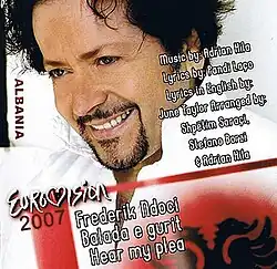 "Hear My Plea" is a song by Albanian singer and songwriter Frederik Ndoci. It was issued as part of a CD compilation on 20 April 2007 by CMC Records. The English-language song was written by Pandi Laço and composed by Adrian Hila. "Hear My Plea" represented Albania in the Eurovision Song Contest 2007 in Helsinki, Finland, after Ndoci won the pre-selection competition, Festivali i Këngës 45, with the song's Albanian-language version "Balada e Gurit". The country failed to qualify for the grand final in 17th place, marking its second non-qualification in the contest. During his dark-themed show of the song, Ndoci was accompanied by an instrumentalist and four backing vocalists. An accompanying music video for the song premiered on the official YouTube channel of the Eurovision Song Contest on 5 April 2007.