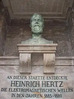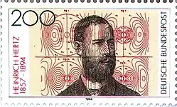 Heinrich Rudolf Hertz (/hɜːrts/ hurts;[3] German: [hɛʁts] ⓘ;[4][5] 22 February 1857 – 1 January 1894) was a German physicist who first conclusively proved the existence of the electromagnetic waves proposed by James Clerk Maxwell's equations of electromagnetism.