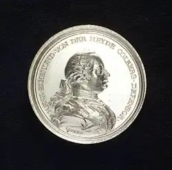 On 26 August 1760, during the second siege of Kolberg, a united force of Swedish and Russian troops surrounded the fortress on water and land. On 27 August, Kolberg was bombarded from the sea by the entire Russian Baltic fleet: twenty-one ships of the line, three frigates and three bomb vessels.[4] On 29 August, they were joined by six ships of line and three frigates of their Swedish allies. Heyde deployed his 700 troops to construct siege works on 6 September; cavalry units covered the construction.[5] He defended Kolberg with his limited number of troops until 18 September, when General Paul von Werner arrived with 3,800 men after a 13-day, 340 kilometres (210 mi) forced march from Silesia. Werner deployed his troops and attacked immediately with such force that the Russians believed they were facing an army of about 20,000; the Russians retreated. Two coins commemorate this act: one with the image of Werner, one with the image of Heyde. The King sent a gold and twenty silver coins with a personal thank you to Heyde. After the second siege of Kolberg, Frederick reevaluated his previously lukewarm opinion of Heyde: I am not infallible; in this man I have been greatly wrong.[1] Financially, Heyde's heroism did not pay off; he received as a commander a salary of 600 taler against of which, shortly before his death, 800 were still owed. Heyde and Werner were promoted to the rank of lieutenant general.[1]