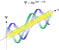 Propagation of de Broglie waves in 1d—real part of the complex amplitude is blue, imaginary part is green. The probability (shown as the colour opacity) of finding the particle at a given point x is spread out like a waveform, there is no definite position of the particle. As the amplitude increases above zero the curvature reverses sign, so the amplitude begins to decrease again, and vice versa—the result is an alternating amplitude: a wave.