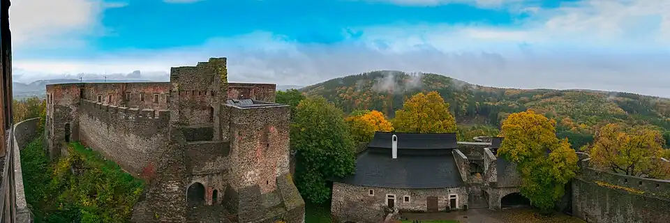 Helfštýn (German: Helfenstein, Helfstein) is a castle ruin in Týn nad Bečvou in the Olomouc Region of the Czech Republic. It is located 15 kilometres (9 mi) east of Přerov. The history of Helfštýn is closely related to the development of the nearby town of Lipník nad Bečvou.