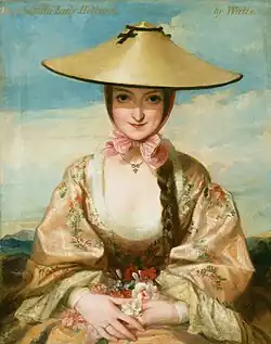 Unable to have surviving offspring, they adopted a 3 month old girl born in France, Marie Fox,[1] later Princess of Liechtenstein, the wife of Prince Louis of Liechtenstein. Her mother's name was given as Frenchwoman Victoire Magny of Soissons, but the identity of her father was unspecified.[1][3][4] She was baptised at the Church of St. Augustine as Marie Henriette Adélaïde.[3] When she was three months old, she was found by a physician called Dr. Séguin, who arranged for her to be adopted by Henry Edward Fox, 4th Baron Holland, and his wife, the former Lady Mary Augusta Coventry.[4] Lord and Lady Holland had no biological children of their own, having gone through two stillbirths[1] and one short-lived child. Lady Holland was in her late thirties and Lord Holland insisted on adopting the girl.[4][5] Her biological paternity remains a mystery; one rumour had it that she was her adoptive father's biological daughter born by his servant.[4] She wrote a two-volume history of Holland House, published in 1874.