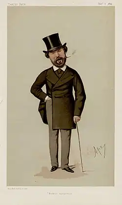 During the break in his Parliamentary career, Labouchère gained renown as a journalist, editor, and publisher, sending witty dispatches from Paris during the Siege of Paris in 1870–1871, noting the eating of zoo elephants, donkeys, cats and rats when food supplies ran low.[16] This series of articles helped restore the circulation of the Daily News, in which he had bought a stake in 1868. His unflinching style gained a large audience for first his reporting, and later his personal weekly journal, Truth (started in 1876), which was often sued for libel.[17] With his inherited wealth, he could afford to defend such suits.[1] Labouchère's claims to being impartial were ridiculed by his critics, including W. S. Gilbert (who had been an object of Labouchère's theatrical criticism) in Gilbert's comic opera His Excellency (see illustration at right). In 1877, Gilbert had engaged in a public feud with Labouchère's lover Henrietta Hodson.[18]