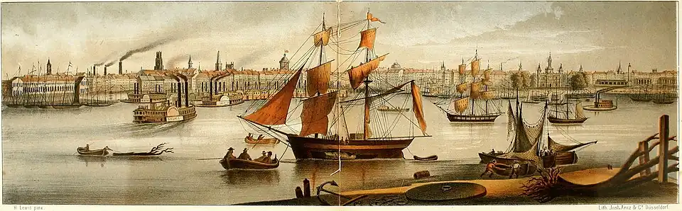 When Lewis' European tour of his panorama reached Düsseldorf, Germany in 1853, Lewis decided to resettle in the city, which was at the time an important center of the arts.[2] He published a book with 80 illustrations based on his panorama, titled Das Illustirte Mississippithal, or, in its never-completed English edition, The Illustrated Mississippi: From the Falls of St. Anthony to the Gulf of Mexico, in 1857.[7][9] The book was "a financial disaster", according to Reps, never coming out in an English edition and selling perhaps 300 copies.[2] The panorama itself was sold to another exhibitor in 1857, who intended to show it in Calcutta (now Kolkata), India. It has since been lost.[7]