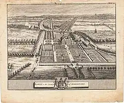 In 1723, through the medium of the King's mistress, Ehrengard Melusine von der Schulenburg, Duchess of Kendal and Munster, he received a pardon and returned to London.[16] Walpole reluctantly accepted his return. In 1725, Parliament passed the Henry St John Bolingbroke Restitution Act 1724 (11 Geo. 1. c. 40 Pr.), which enabled him to hold real estate but without power of alienating it. But this had been effected in consequence of a peremptory order of the King, against Walpole's wishes, who succeeded in maintaining his exclusion from the House of Lords. He now bought an estate at Dawley, near Uxbridge, where he renewed his intimacy with Alexander Pope, Jonathan Swift and Voltaire, took part in Pope's literary squabbles, and wrote the philosophy for Pope's An Essay on Man (1734),[15] which, at Epistle I, begins: "To Henry St. John, Lord Bolingbroke: