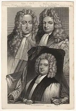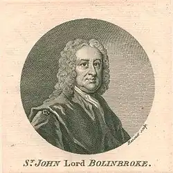 Henry St. John, 1st Viscount Bolingbroke (16 September 1678 – 12 December 1751) was a British Tory politician and philosopher. He was a leader of the Tories, and supported the Church of England politically despite his antireligious views and opposition to theology.[1][2][3][4][5] Bolingbroke supported the Jacobite rebellion of 1715, which sought to overthrow the new king George I. Escaping to France, he became foreign minister for the Jacobite pretender James Francis Edward Stuart. He was attainted for treason but reversed course and was allowed to return to England in 1723. According to Ruth Mack, "Bolingbroke is best known for his party politics, including the ideological history he disseminated in The Craftsman (1726–1735) by adopting the formerly Whig theory of the Ancient Constitution and giving it new life as an anti-Walpole Tory principle."[6]