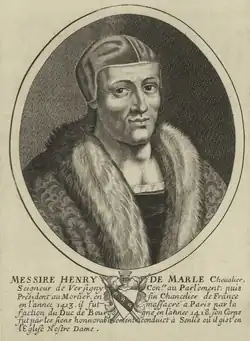 Henry of Marle, seigneur de Presles, was chancellor of France under king Charles VI from 1413 to 1418. As a faithful companion of John I of Berry, he was assassinated in the Conciergerie during the massacres of the Armagnacs in the prisons of Paris on 29 May 1418.