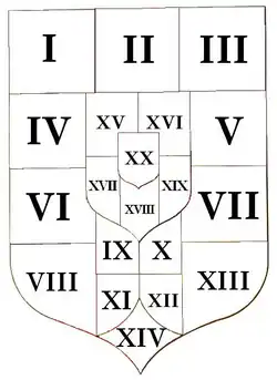 Before 1915, the arms of the different territories of the Austrian part of the Empire (heraldry was added to some areas not shown in the previous version and to the left to the Hungarian part) appeared together in the shield positioned on the double-headed eagle coat of arms of the Austrian Empire as an inescutcheon. The eagle was inside a shield with a goldfield. The latter shield was supported by two griffins and was topped by the Austrian Imperial Crown (previously these items were included only in the large shield). Then, shown in the center of both arms of dominion, as an inescutcheon to the inescutcheon, is the small shield, i.e. personal arms, of the Habsburgs. All this was surrounded by the collar Order of the Golden Fleece.[2][3]