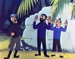 In this version, Max Bird escapes from prison with the help of an accomplice. He participates in the search for the treasure, while he no longer appears after his escape in the comics. Professor Calculus already knows Tintin, even though this is his first appearance in the comic strip. During the trip, Max Bird's accomplice succeeds in stealing the plans that lead to the treasure. Although he is not hard of hearing in this series, Professor Calculus has the time of this episode some hearing problems following the explosion of a failed device. Upon arrival on the island, Tintin and his friends are attacked by the natives. They continue their research and discover a fetish of Sir Francis Haddock. Thompson and Thomson, who transport it, are kidnapped by the natives, who bear a strong resemblance to the Arumbayas from The Broken Ear. These natives then tried to behead them, as an offering to the fetish, which they consider to be an idol. Captain Haddock hides behind his ancestor's fetish and imitates him, saying he does not want this gift. The natives bow and kneel. Tintin takes the opportunity to free the detectives. On the island, Max Bird and his accomplice are on the verge of suppressing Tintin and his friends, but miss their target. It is the fetish which is touched, in the nose. Snowy, hidden behind the two bandits, attacks them. Max Bird's accomplice is caught and questioned. During the excavations in the wreck of The Unicorn, Tintin is attacked by Max Bird, who tries to cut his rope and his air inlet tube. An octopus attacks him, Tintin saves him and it is for Bird the end of the adventure. Haddock had an encounter with shark rather than Tintin. Tintin and his friends return to the island, discover a cross planted by Sir Francis Haddock and think that it indicates the location of the treasure. Their research is in vain. But new worries await them: the natives capture them. They were however abandoned when the natives noticed that a volcano was erupting (similar to Flight 714 to Sydney). They are freed by the Thom(p)sons who, as carriers, were not tied up. The island sinks and everyone is saved in time. Tintin and Captain Haddock discover the treasure in the Hudson Manor (Marlinspike Hall). Max Bird tries to escape with it, but runs into Professor Calculus. Tintin takes the opportunity to disarm him. A fight ensues where Calculus intervenes, knocking out Bird Brother with a painting.