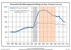 Development of Population since 1875 within the Current Boundaries (Blue Line: Population; Dotted Line: Comparison to Population Development of Brandenburg state; Grey Background: Time of Nazi rule; Red Background: Time of Communist rule)