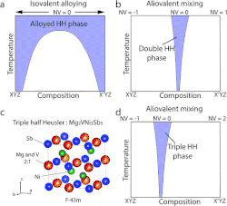 Although traditionally thought to form at compositions XYZ and X2YZ, studies published after 2015 have discovered and reliably predicted Heusler compounds with atypical compositions such as XY0.8Z and X1.5YZ.[8][9] Besides these ternary compositions, quaternary Heusler compositions called the double Half-Heusler X2YY'Z2 [10] (e.g. Ti2FeNiSb2) and triple Half-Heusler X2X'Y3Z3 [7] (for e.g. Mg2VNi3Sb3) have also been discovered. These "off-stoichiometric" (that is, differing from the well-known XYZ and X2YZ compositions) Heuslers are mostly semiconductors in the low temperature T = 0 K limit.[11] The stable compositions and corresponding electrical properties for these compounds can be quite sensitive to temperature[12] and their order-disorder transition temperatures often occur below room-temperatures.[10] Large amounts of defects at the atomic scale in off-stoichiometric Heuslers helps them achieve very low thermal conductivities and make them favorable for thermoelectric applications.[13][14] The X1.5YZ semiconducting composition is stabilized by the transition metal X playing a dual role (electron donor as well as acceptor) in the structure.[15]