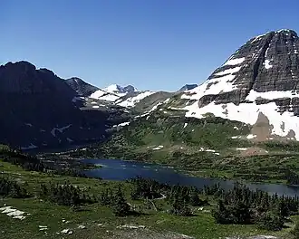 Hidden Lake is located in Glacier National Park, in the U.S. state of Montana. The lake is surrounded by several peaks, including Bearhat Mountain to the southwest, Dragons Tail to the south, Clements Mountain to the north, and Reynolds Mountain to the east.[2] It is a popular destination for hikers, with the Hidden Lake Overlook Trail leading to the lake.
