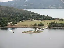 The High Island Detention Centre (Chinese: 萬宜羈留中心) was a refugee camp in Hong Kong built near the West Dam of High Island Reservoir for hosting refugees and boat people from Vietnam. The area is now a flat piece of grassland that is grazed by cows. It has a pavilion that leads out of the strip of land.