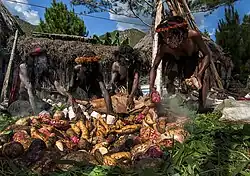 The traditional food of Papuan from the Central Highland, usually consists of roasted boar with Tubers such as sweet potato (hipere) as the staple food.[74] This is unlike the staple foods in the lowlands of Western New Guinea and eastern Indonesia in general with sago, or western Indonesian cuisines that favour rice as their staple food.[75] In Highland Papua, pig roast which consists of pork and yams are roasted in heated stones placed in a hole dug in the ground and covered with leaves; this cooking method is called bakar batu (burning the stone), and it is an important cultural and social event among Papuan people.[76] In some Papuan communities who are Muslim or when welcoming Muslim guests, pork can be replaced with chicken or beef or mutton or can be cooked separately with pork. This is, for example, practiced by the Welesi and Meteo communities in Jayawijaya Regency to welcome the holy month of Ramadan.[77]