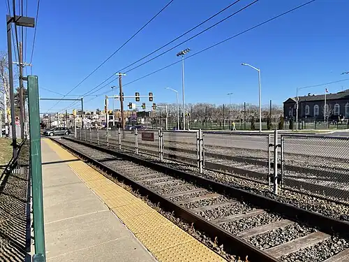 Hilltop Road station is a SEPTA Metro D station in Upper Darby Township, Pennsylvania. It is officially located at Garrett Road and Hilltop Road, but also includes Bywood Avenue as it parallels the north side of the line. The station serves both the D1 and D2, and only local service is provided on both lines. The station contains two platforms with plexiglass bus-type shelters on both sides of the tracks, both of which are at the far end of each platform. The Beverly Hills Middle School is across from the south side of the station along Hilltop Road.[1]