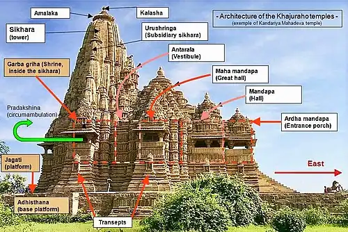 Hindu temple architecture has many varieties of style whose historic role has been to provide "a focus for both the social and spiritual life" for the Hindu community it serves, states George Michell.[26] Every Hindu temple ("mandir") is imbued with symbolism, yet the basic structure of each stays the same. Each temple has an inner sanctum or the sacred space, the garbha griha or womb-chamber, where the primary murti or the image of a deity is housed in a simple bare cell for darshana (view, meditative focus).[27] Above the garbhagriha is a tower-like shikhara, called the vimana in south India. This sanctum is surrounded by a closed or open path for pradakshina (also called parikrama, circumambulation) that is typically intricately carved with symbolic art depicting Hindu legends, themes of artha, dharma and kama as well as the statues of significant deities of three major Hindu traditions (Vishnu, Shiva and Shakti).[28]