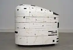 Hamada transforms non-art materials, enamel, tar, wax, burlap, plastic, into powerful artistic forms, and arranges those industrial and even brutal materials in gentle, smooth shapes.[6] Surfaces are "richly textured",[7] often marked by sectioning. Cited in Art: A Brief History for his contribution to "new ideas in traditional materials," Stokstad notes, "There is an archetypal quality to his elemental sculptural forms.They seem strange but at the same time hauntingly familier, remaining open to a variety of viewer associations."[8] The output is a series of non-representational artworks, named by numbers in a sequence. "As an artist he tries to ignore outside references, preferring instead for his work to come from a truly interior space. His artwork is a product of the mind, unburdened by the need to think in real world images".[9]