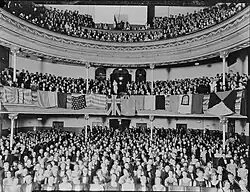 The auditorium contained a proscenium arch,[16] with a raked stage 20 by 23 metres (66 by 75 ft) in size.[17] The auditorium measured 23 by 21 metres (75 by 69 ft),[17] and its original capacity was 2584 people in three tiers.[2] The interior of the theatre was a typical Edwardian horseshoe-shape to bring the audience closer to the performers.[2][17] It featured stalls (seating 974), a dress circle (seating 540), an upper gallery (seating 1,074) and private boxes.[2][5]