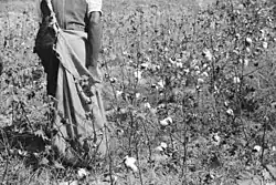 The cotton industry in the United States hit a crisis in the early 1920s. Cotton and tobacco prices collapsed in 1920 following overproduction and the boll weevil pest wiped out the sea island cotton crop in 1921. Annual production slumped from 1,365,000 bales in the 1910s to 801,000 in the 1920s.[27] In South Carolina, Williamsburg County production fell from 37,000 bales in 1920 to 2,700 bales in 1922 and one farmer in McCormick County produced 65 bales in 1921 and just 6 in 1922.[27] As a result of the devastating harvest of 1922, some 50,000 black cotton workers left South Carolina, and by the 1930s the state population had declined some 15%, largely due to cotton stagnation.[27] However, it was not the collapse of prices or pests which resulted in the mass decline of African-American employment in agriculture in the American south. The mechanization of agriculture is undoubtedly the most important reason why many Black people moved to northern American cities in the 1940s and 1950s during the "Great Migration" as mechanization of agriculture was introduced, leaving many unemployed.[28] The Hopson Plantation[29] produced the first crop of cotton to be entirely planted, harvested and baled by machinery in 1944.[28]