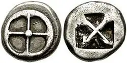 | Obv: Four-spoked wheel | Rev: Incuse square, divided diagonally |
