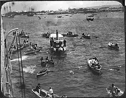 By 1660, Barbados generated more trade than all the other English colonies combined. This remained so until it was eventually surpassed by geographically larger islands like Jamaica in 1713. But even so, the estimated value of the Colony of Barbados in 1730–1731 was as much as £5,500,000.[18] Bridgetown, the capital, was one of the three largest cities in English America (the other two being Boston, Massachusetts, and Port Royal, Jamaica.) By 1700, the English West Indies produced 25,000 tons of sugar, compared to 20,000 for Brazil, 10,000 for the French islands and 4,000 for the Dutch islands.[19] This quickly replaced tobacco, which had been the island's main export.