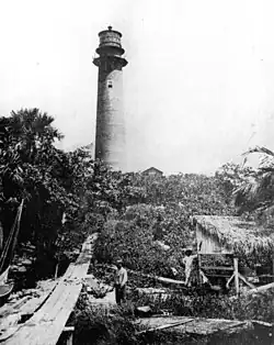 The county's oldest surviving structure, the Jupiter Lighthouse, was completed in 1860, six years after receiving authorization to the land from President Franklin Pierce.[15] During the American Civil War, Florida was a member of the Confederate States of America. To aid the cause of their state, Augustus O. Lang and James Paine removed the lighting mechanism, dimming the lighthouse and assisting their blockade runners.[16] Lang was also the first white settler in Palm Beach County. He built a palmetto shack along the eastern shore of Lake Worth in 1863 after abandoning the cause of the Confederacy.[17] After the Civil War ended, the Jupiter Lighthouse was re-lit in 1866.[16] A National Weather Service office was established at the lighthouse complex in the 1870s. However, the office was moved to Miami in 1911 after that city's population began to rapidly grow.[18]