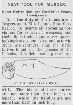 Polish immigrants were highly desired by American employers for low-level positions. In steel mills and tin mills, it was observed that foremen, even when given the choice to directly employ workers of their own ethnic background, still desired to choose Poles. Steel work was undesirable to other immigrant groups, as it lasted 12 hours a day and 7 days a week, self-selecting for the most industrious and hardworking people. Polish immigrants chose to chain-market the job positions to their friends and relatives, and it was very common for a Polish friend with good English to negotiate wage rates for newer immigrants.[68] Polish Americans favored steel areas and mining camps, which had a high demand for manual labor; favorite destinations included Chicago, Detroit, Milwaukee, Cleveland, Buffalo, New York, and Pittsburgh, as well as smaller industrial cities and mining towns. Relatively few went to New England or to farming areas; almost none went to the South. Poles came to dominate certain fields of work: in 1920, 33.1% of all U.S. coal-mine operatives and 25.2% of all blast furnace laborers were Polish.[69] Polish immigrants were categorized for low-status positions within U.S. companies, as the same steel companies that recruited Polish immigrants for work in blast furnaces recruited Irish immigrants for work with finished metal.[70]