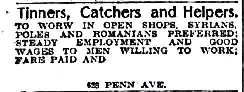 A 'Want Ad' dated July 15, 1909 for positions in the U.S. Steel Corporation. It reads To Work in Open Shops. Syrians, Poles, and Romanians Preferred.