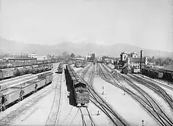 The San Pedro, Los Angeles and Salt Lake Railroad began serving San Bernardino in 1905, arriving via Santa Fe trackage rights over Cajon Pass. This railroad, soon renamed the Los Angeles and Salt Lake, (LA&SL) used as its corporate logo an adaptation of the famous "arrowhead" natural feature located north of the city. The LA&SL was fully acquired by the Union Pacific Railroad in 1921.