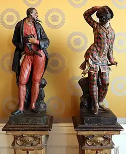 The characters of the commedia usually represent fixed social types and stock characters, such as foolish old men, devious servants, or military officers full of false bravado.[63][68] The characters are exaggerated "real characters", such as a know-it-all doctor called Il Dottore, a greedy old man called Pantalone, or a perfect relationship like the Innamorati.[62] Many troupes were formed to perform commedia, including I Gelosi (which had actors such as Andreini and her husband Francesco Andreini),[69] Confidenti Troupe, Desioi Troupe, and Fedeli Troupe.[62][63] Commedia was often performed outside on platforms or in popular areas such as a piazza (town square).[61][63] The form of theatre originated in Italy, but travelled throughout Europe - sometimes to as far away as Moscow.[70]